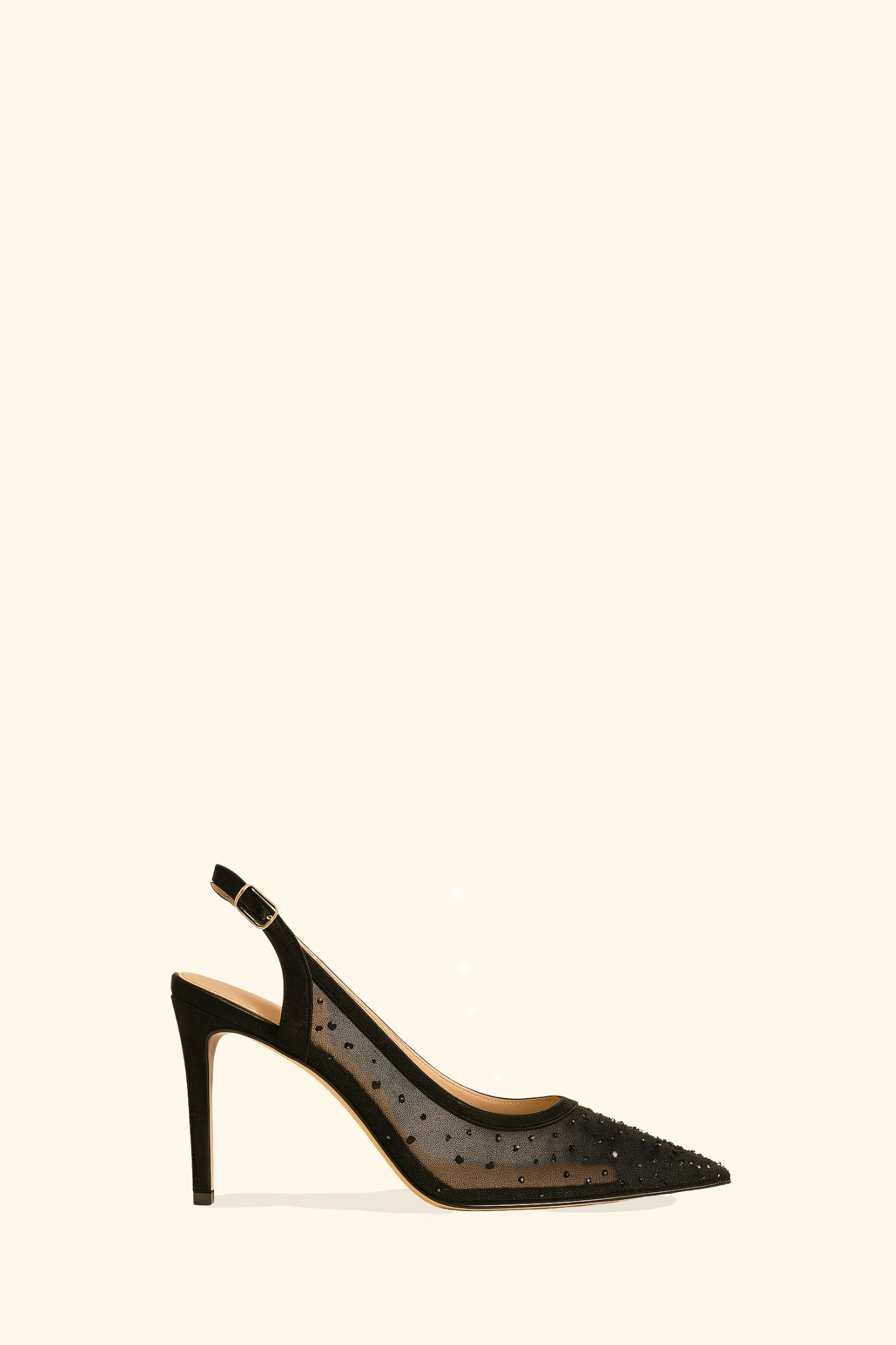 Les Loeva sont des escarpins slingback en tulle noir recouverts de strass, avec un bout pointu qui élance la silhouette. Légers, élégants et faciles à porter, ils sont parfaits pour une soirée, un look habillé ou une sortie dans les rues de Paris.