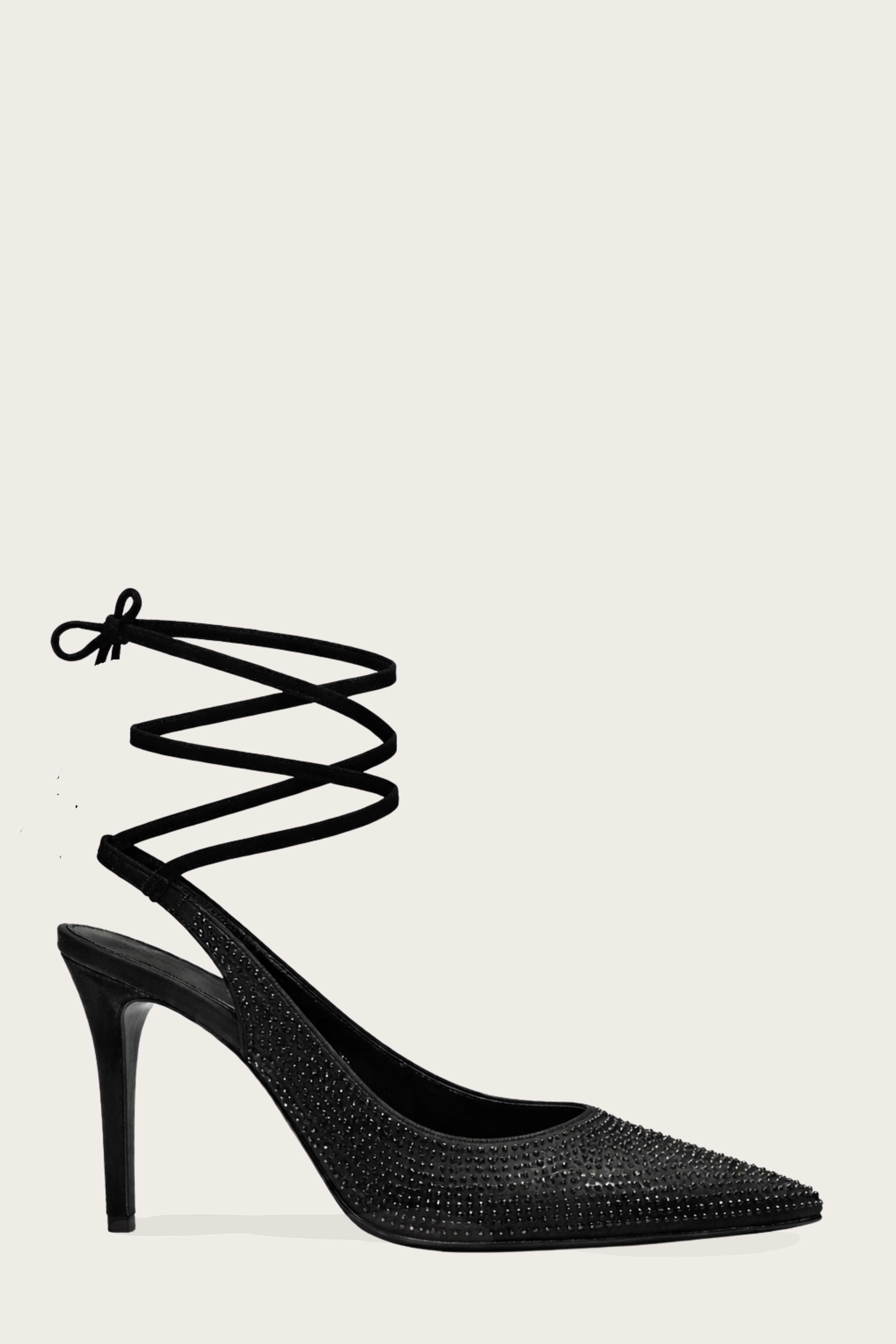 Escarpins à talon fin avec bout pointu. Finition texturée avec strass ton sur ton. Lanière arrière ouverte et liens à nouer autour de la cheville pour un maintien ajusté.