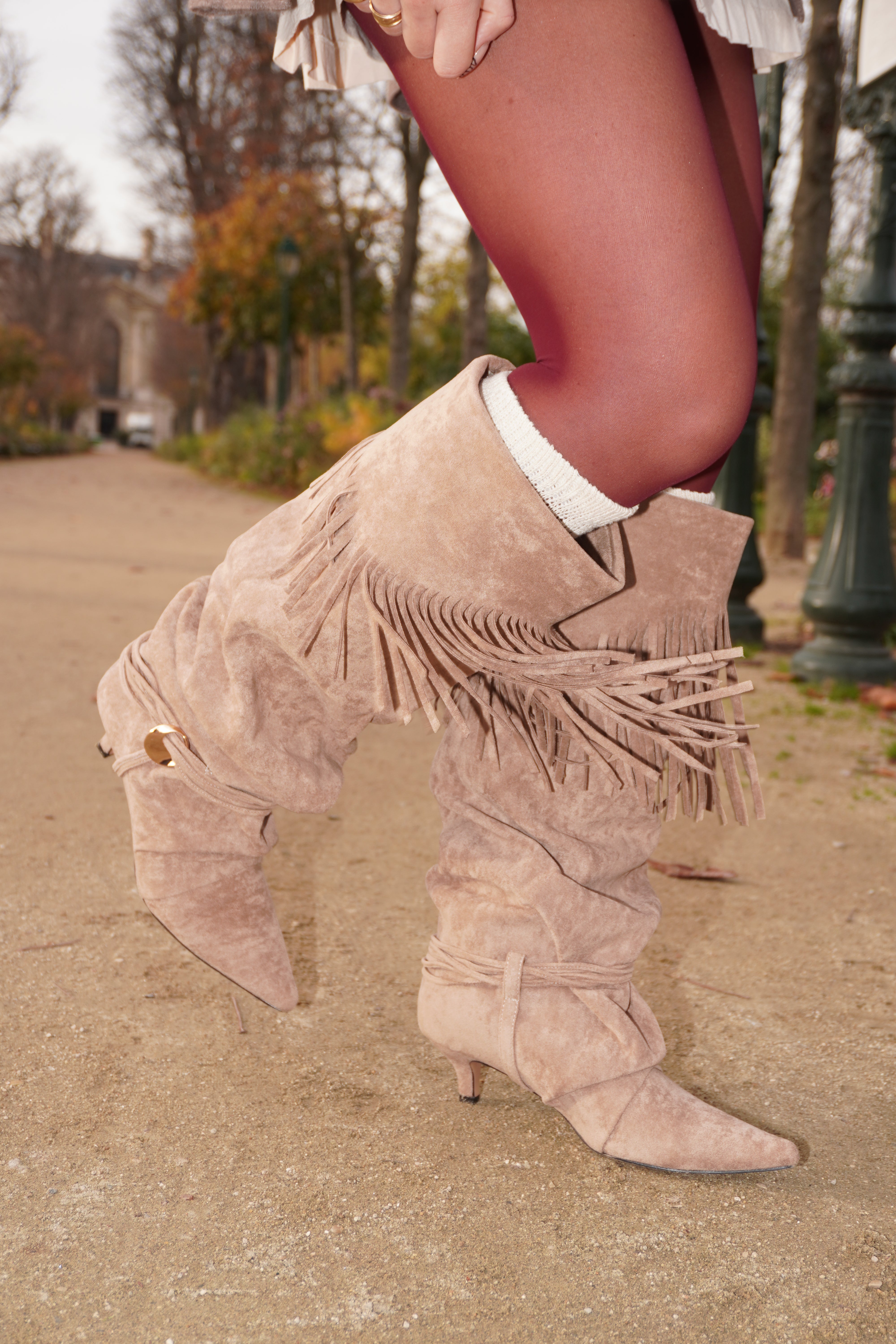 Une paire full cosy vibes : suédine toute douce, franges qui bougent à chaque pas et petit talon kitten super comfy. Le combo parfait pour un look d’hiver tendance sans se fatiguer.