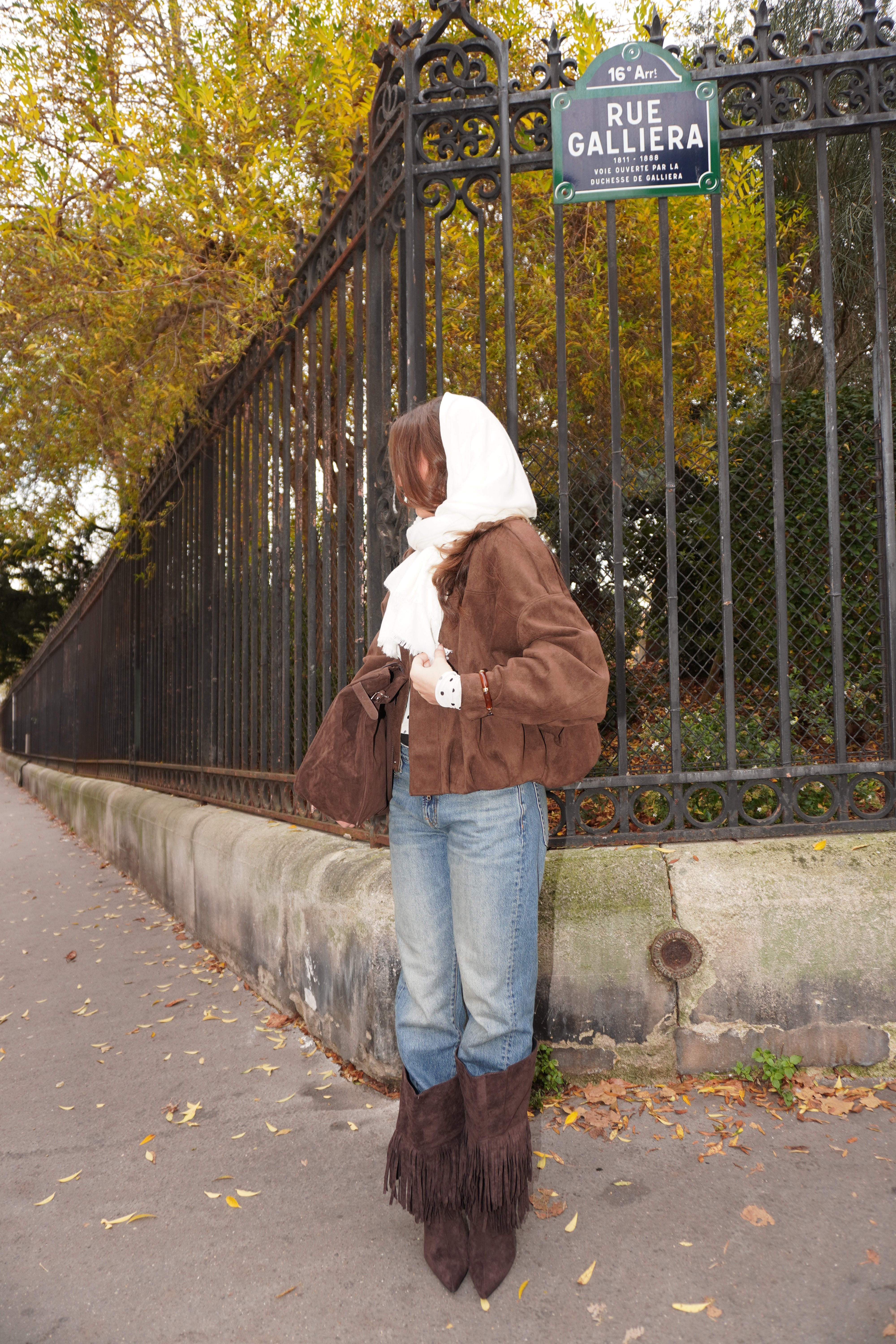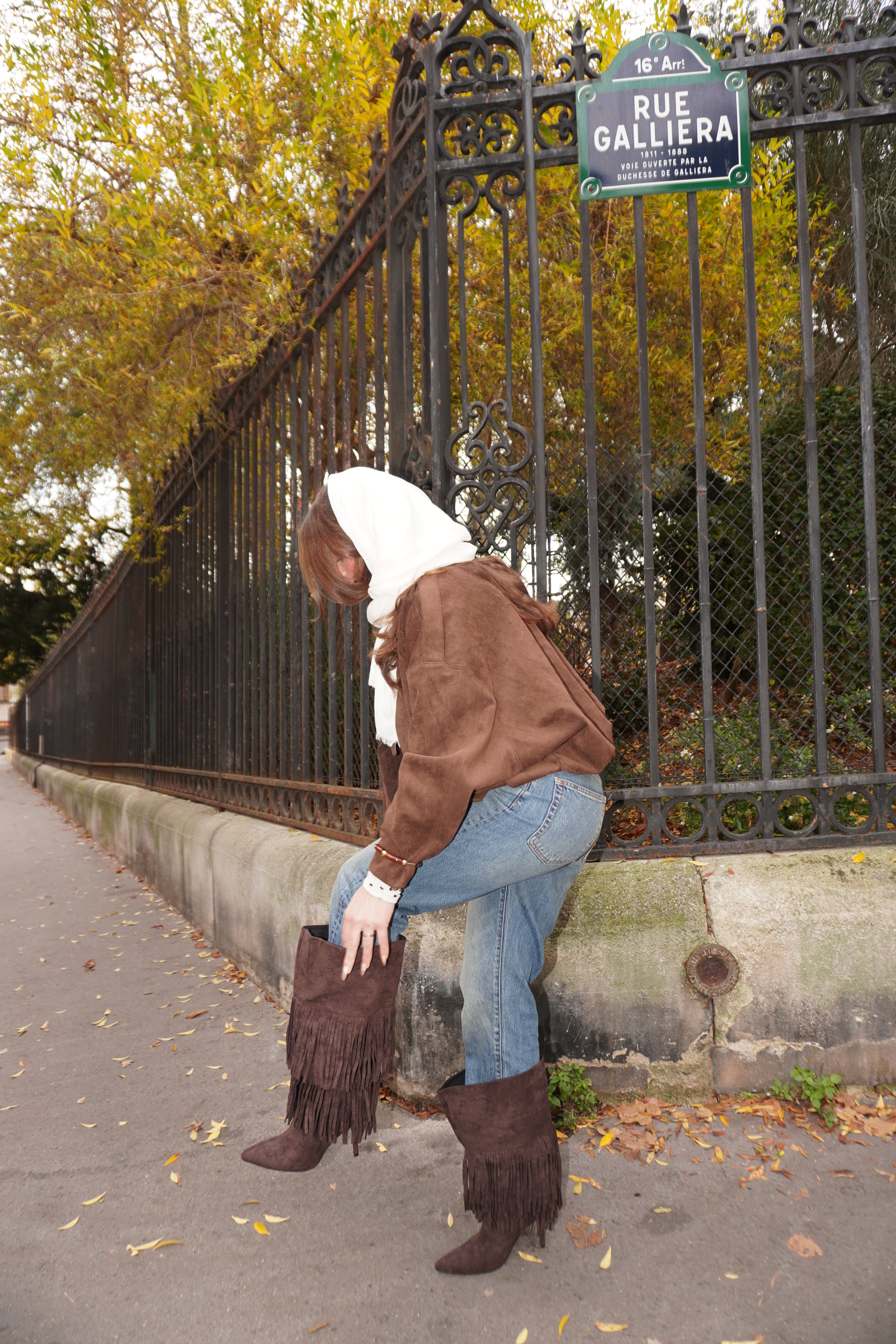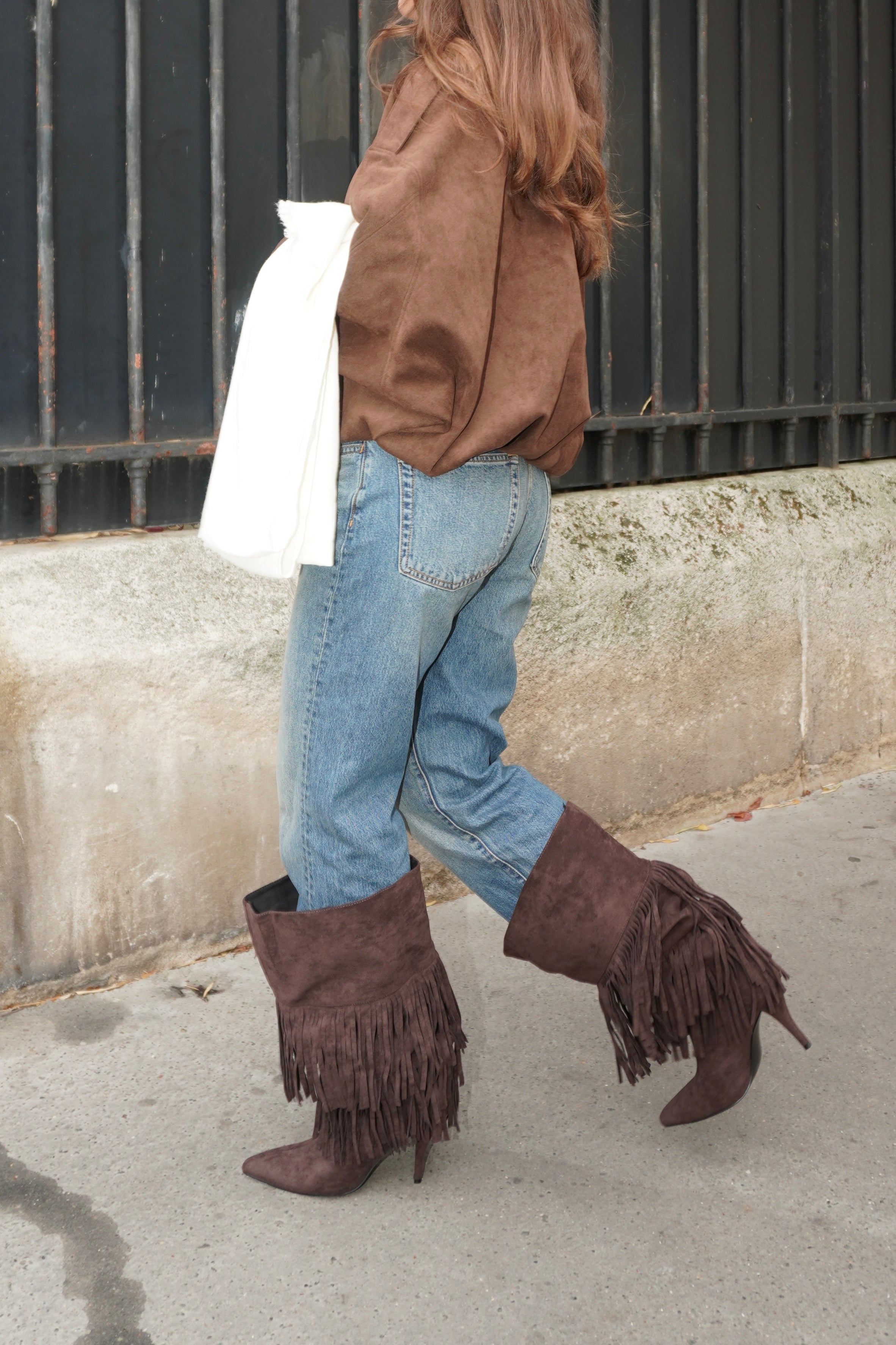 Bottes larges, suédine, marron, franges. Tige haute, lignes nettes, mouvement marqué. Franges oversize qui rythment la silhouette à chaque pas. Une pièce forte, pensée pour structurer une tenue et créer une présence immédiate.