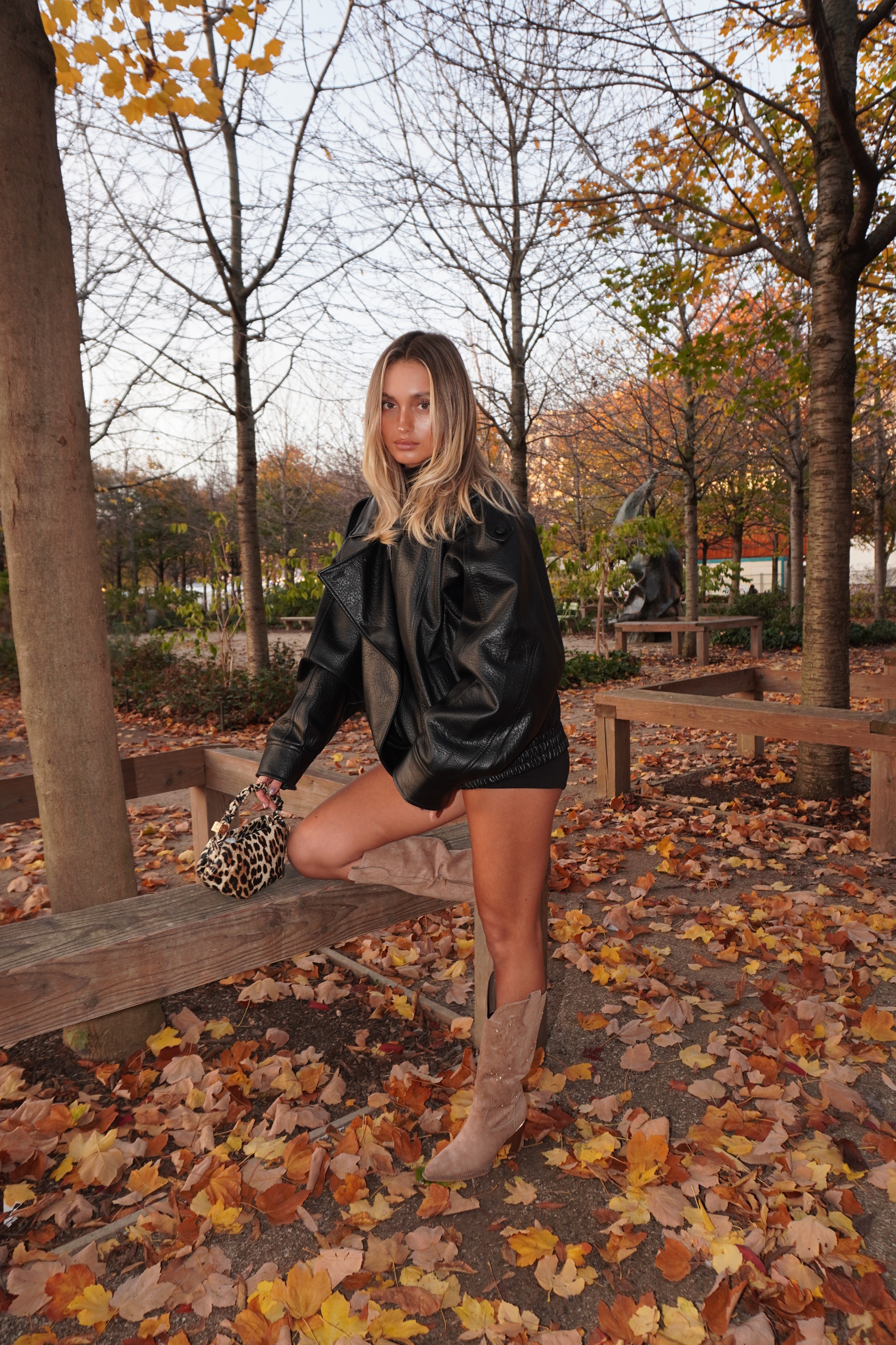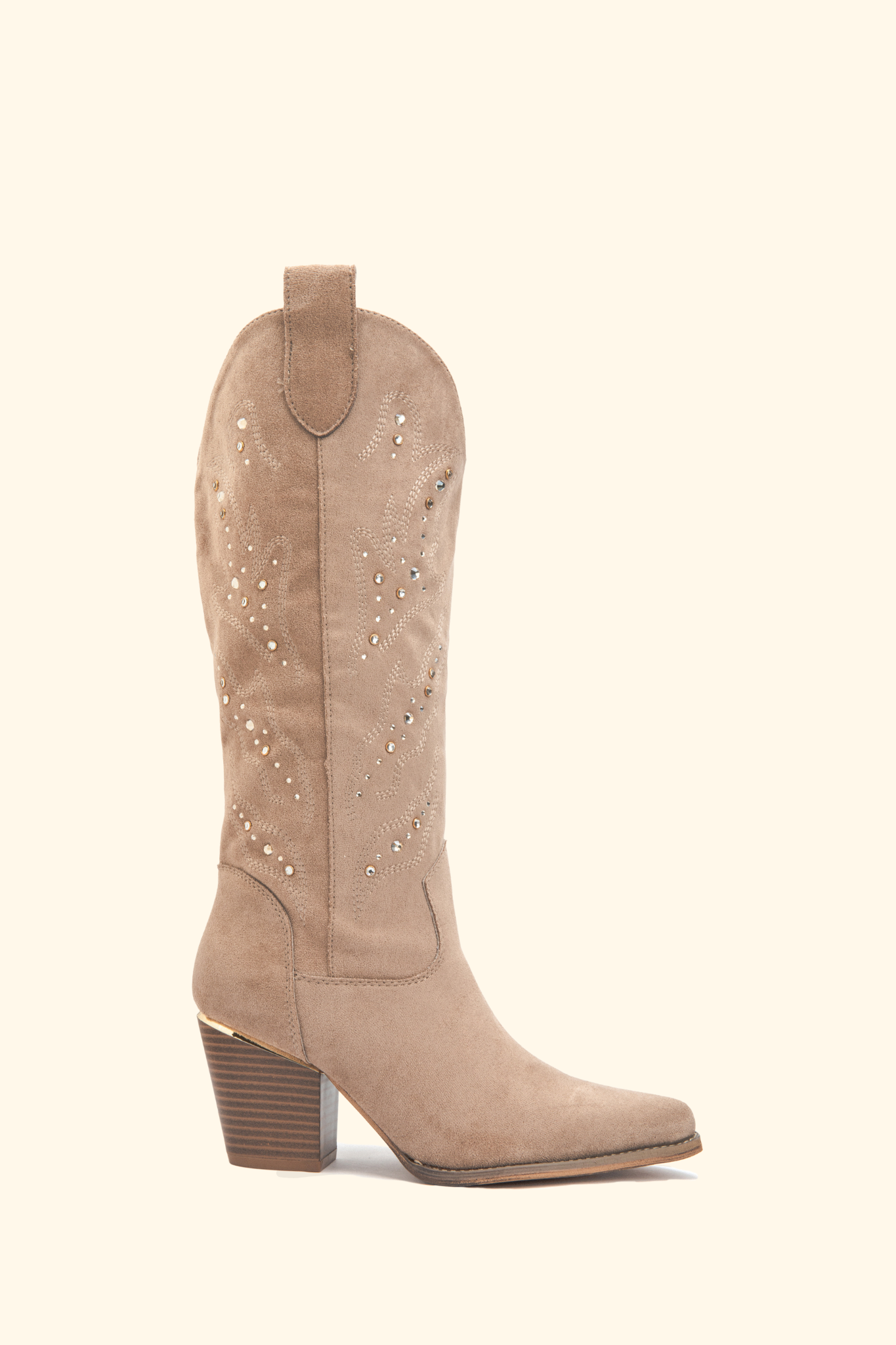 Une santiag en suédine avec de beaux strass, parfaite pour upgrader n’importe quel outfit d’hiver.